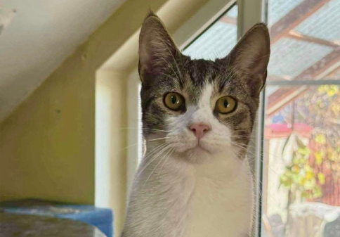 Hij is een geweldig aanhankelijk katertje en heel erg gehecht aan mensen. Hij purt al als je hem nog maar aankijkt. Wie geeft hem zijn fluwelen mandje ?)
